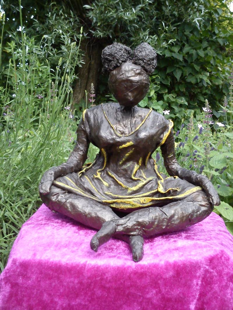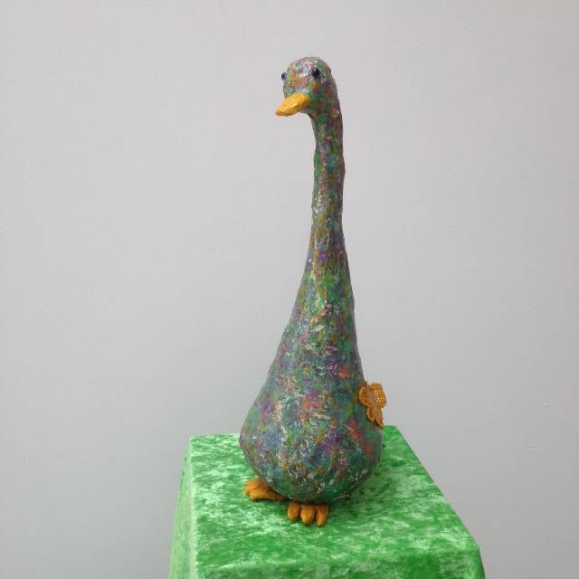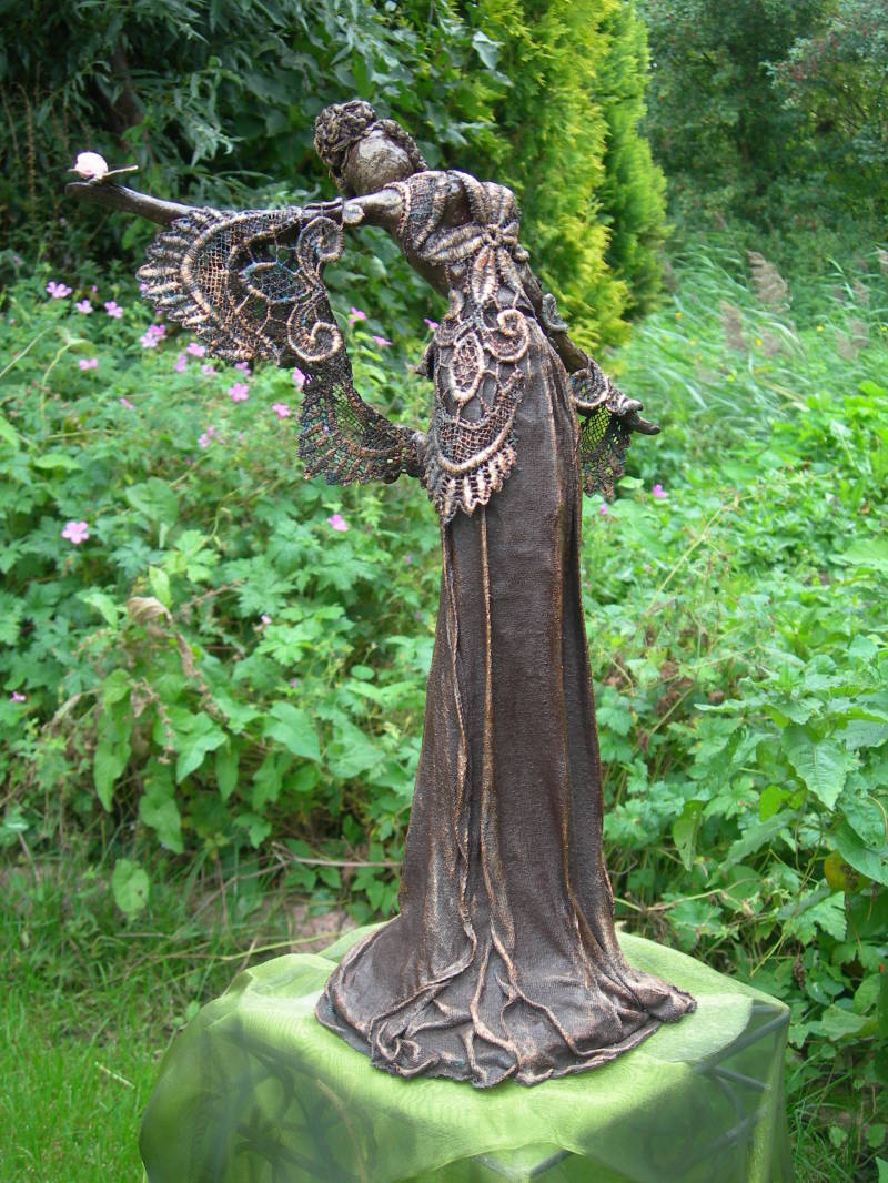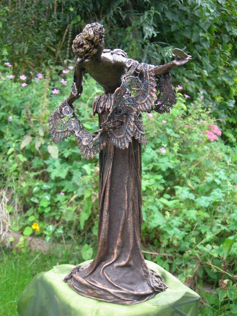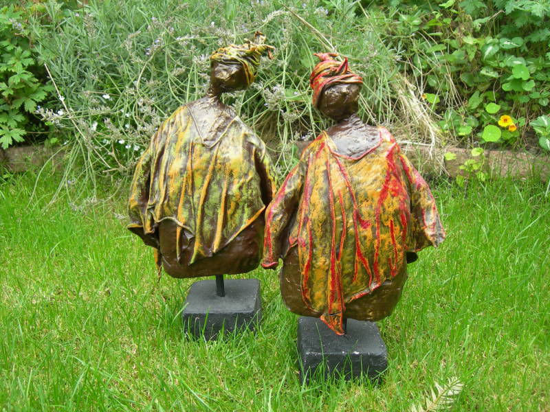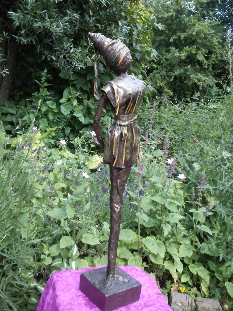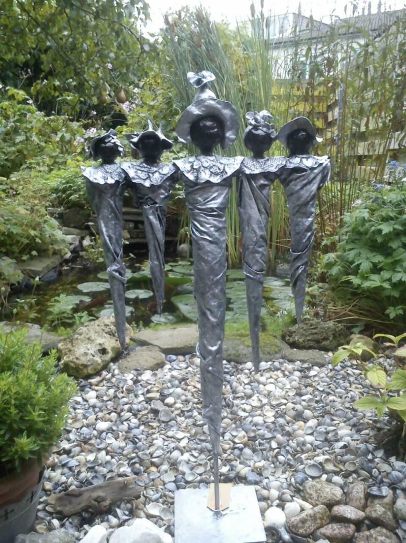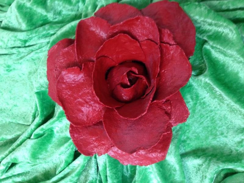 Je kunt hem op een stalen steel van 1,5 mtr. zetten, dan prik je 'm zo tussen de planten in je tuin. Deze stelen zijn in het atelier aanwezig. De roos is ook in andere kleuren te maken.