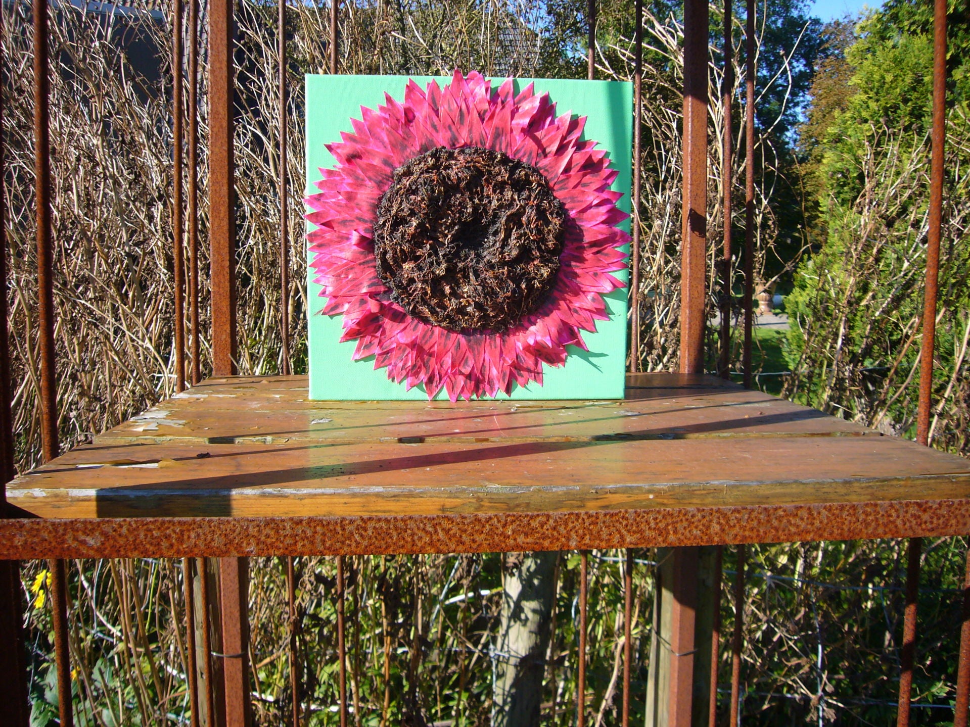 Iedereen die in mijn atelier komt werken kan gebruik maken van alle aangeboden materialen. Met Powertex is veel te doen, zowel beeldjes als sculpturen zijn er mee te maken en zelfs schilderijen behoren tot de mogelijkheden. Tyvek is een bijzonder materiaal dat prima is te gebruiken om op een aparte manier een beeldje mee aan te kleden, maar het leent zich ook uitstekend voor het verwerken in schilderijen. Zie bv. hier onder het schilderij met Tyvektulpen.